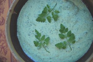 Then you pop it in a blender with some sour cream, creme fraiche and buttermilk, let it rip for a bit and dollop it over some new potatoes and boiled eggs.