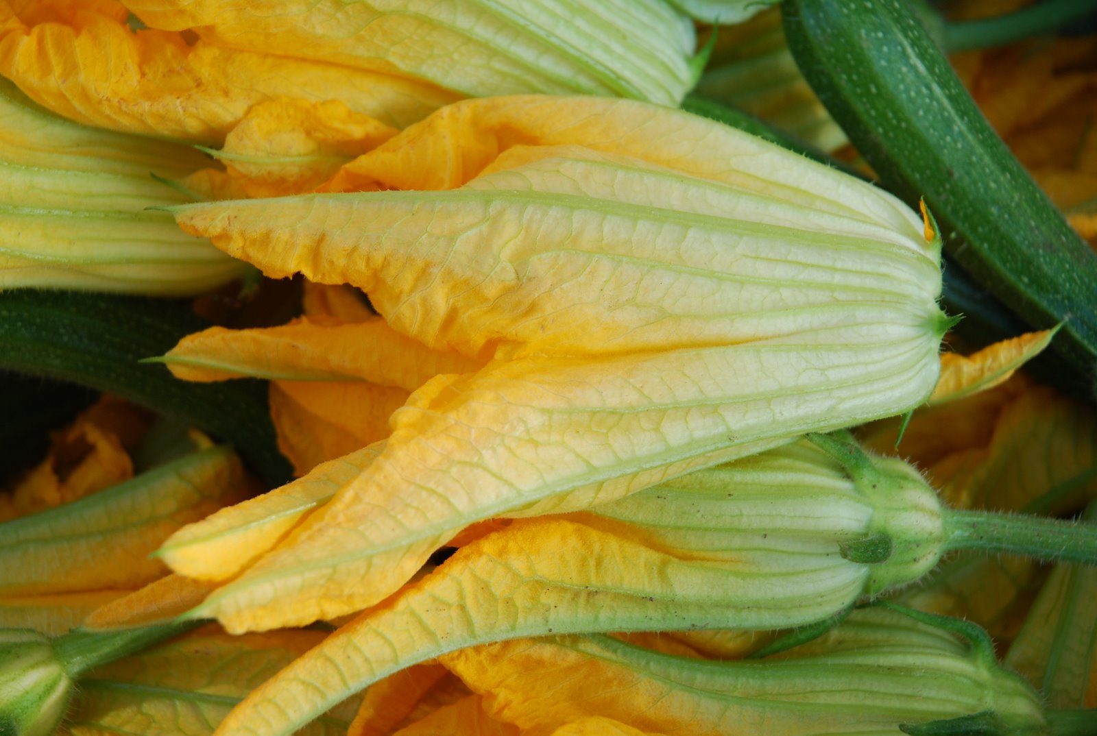 >The zucchini blossoms were so fresh on the market yesterday that bumble bees were still zipping in and out in a futile attempt at pollination.