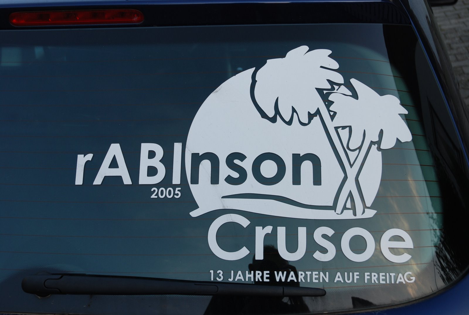 A play on words with “Robinson Crusoe” incorporating “Abi” and the strapline “We’ve been waiting 13 years for Friday”, as in Man Friday or Friday, the last day of school..