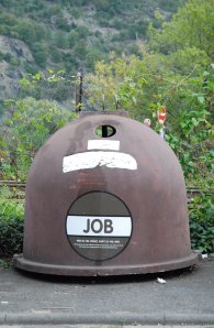 >In the Bible, Job was punished after Satan claimed him. Perhaps this recycling container is being punished when the bottles are tossed in.