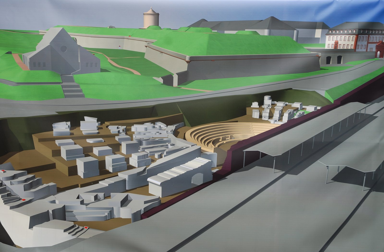 The one next to it is a poster of the area, with the local station on the foreground, the Roman amphitheatre (tomorrow?) and the Zitadelle in the background.