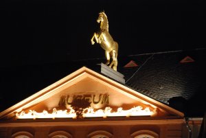 Originally: The stables of the neighbouring Prince Elector’s palace, crowned with a massive gold-plated copper stallion* which led to its being called “The Golden Horse Barracks”