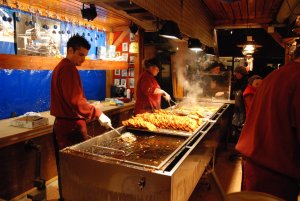 I don’t really care for the Christmas Market in Mainz. Tends to be too full of cheap mulled wine stands, festive candle purveyors, knick-knack sellers and sausage-on-a-stick merchants for my liking. But there is one very good reason for making the pilgrimage and that’s the Kartoffelpuffer (potato pancake) outfit.
