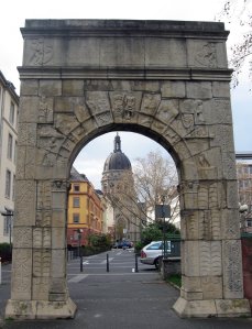 I stumbled across this arch the other day, while my niece and nephew played in the park nearby. The church in the background is Christ Church. The arch depicts the signs of the zodiac.