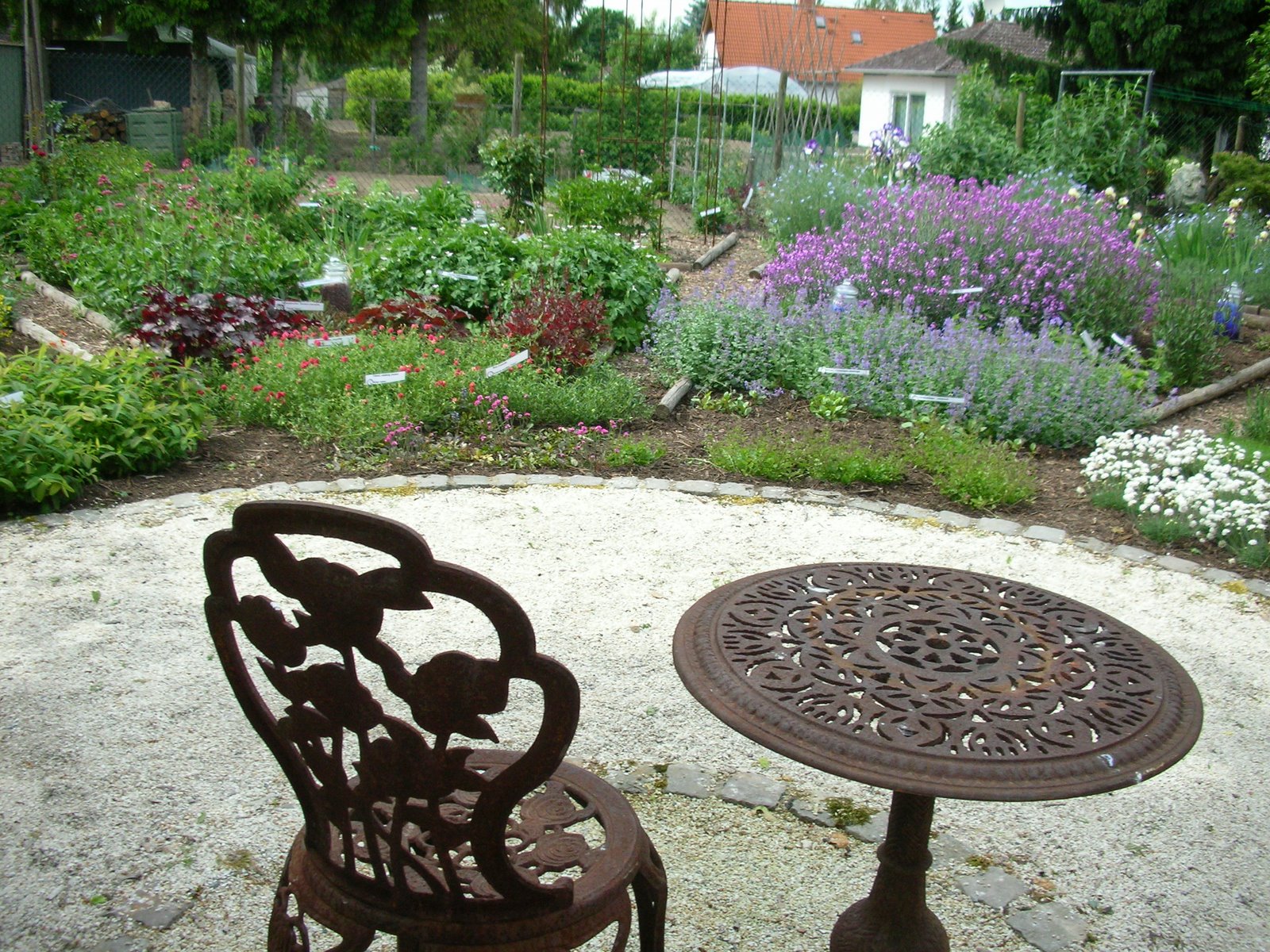 The centrepiece is a fan-garden, with a semi-circle of colour-focused flower beds emanating from gravel seating area.