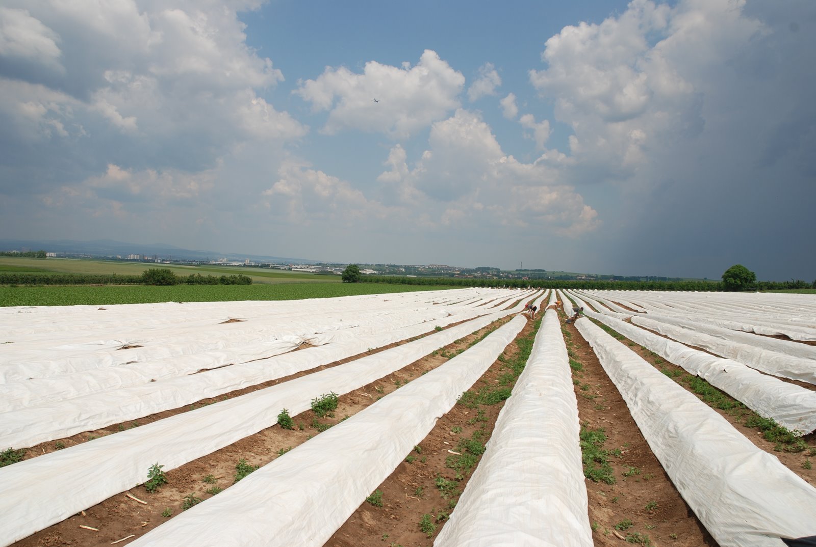 They cover the mounds with plastic sheeting that’s black on one side (to absorb the sun’s energy and warm the soil) and white on the other (to reflect the sun’s rays and regulate the growth) and they switch them around as needed.