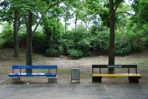Overnight, park benches (these are at the Vertical Village) appear in the colours of participants’ national flag.