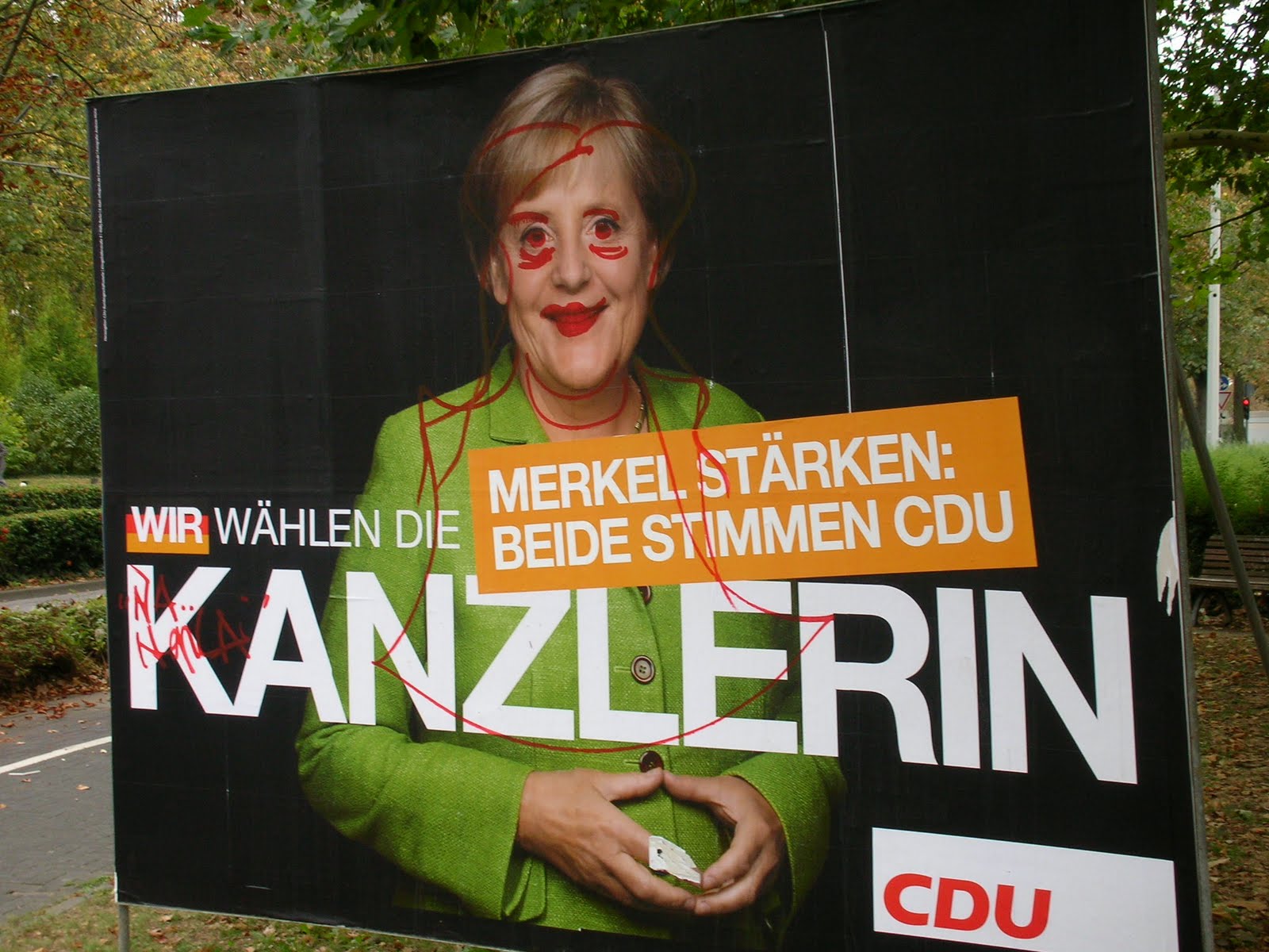 Defaced face in Mainz after the Federal election.
