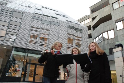 Two flossies tra-la-la-ing and another playing a mean flute, adding an attractive note to the enduring ugliness of the Brand shopping centre