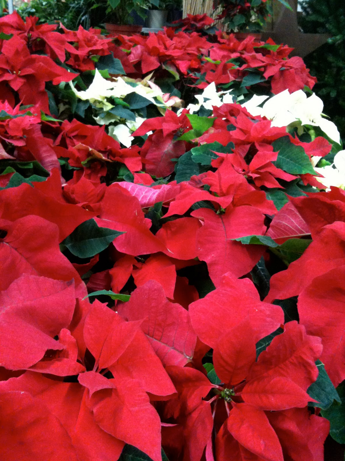 >Good morning, JB. Yes, this is a very festive holiday post; nothing quite like red poinsettias! Did you see the blue ones on Phoenix's blog a few days ago? Like these traditional ones much better.We DID get a blanket of snow last night but mercifully not as bad as predicted. Neighborhood is eerily quiet with few cars on the street. Driving will be daunting. Going to wend my way down to the neighborhood cafe for some latte, taking some photos as I walk. Just now through the window "in a room of my own" observing some poor motorist trying to manuever the hill to get to an intersection. Neither he nor the garbage truck in front of him will make it. Now they're backing up. Better to walk as I intend to do. Are you thrilled with my description of this winter wonderland?!