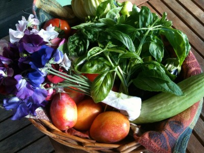 Sweet peas, plums, paprika, aubergine (eggplant for our colonial cousins – sheesh..), 4 varieties of tomato (tomayto) , cucumber, basil (baysil).