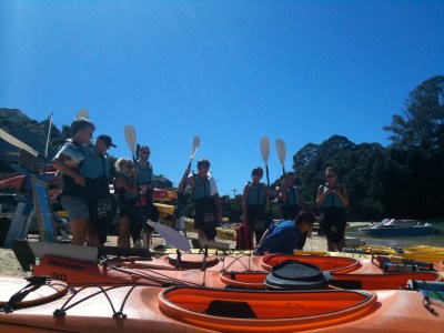 These folk on a kayaking tour in Kaiteriteri were being given the usual routine today – how not to roll the boat, how not to catch crabs with the paddle, how not to get a sunburn.