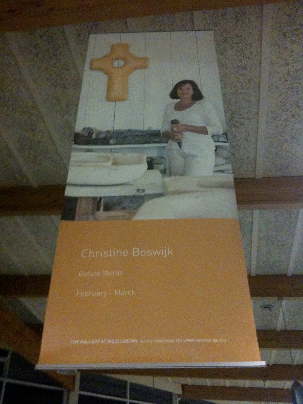 When you get to Nelson airport, you see this massive poster hanging from the ceiling, announcing “Before Words“, her current major exhibition at the Woolaston Winery.