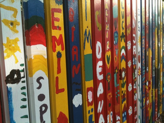 At some stage, the littlies at the St Stephan Catholic kindergarten in Gonso were provided with buckets of paint and brushes and instructed to a) not make a mess and b) immortalise themselves on a technicolour picket fence outside the kindy.