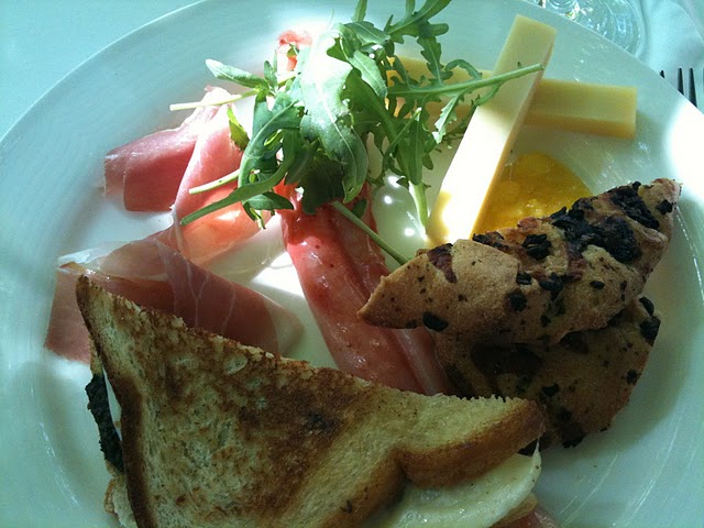 *Asparagus spears in a strawberry-balsamico vinaigrette, cheese with a passionfruit-lemon jam, Parma ham, olive ciabatta, cheese and pesto pannini.