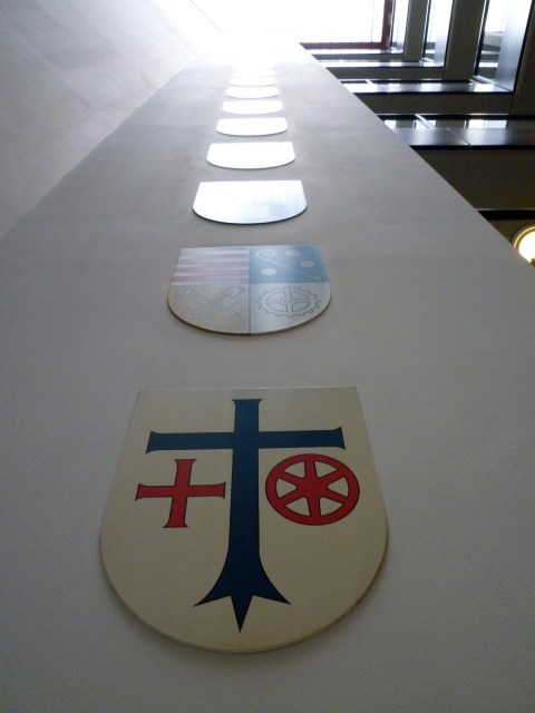 The various Mainz city coats of arms in the town hall, starting with Ebersheim at the bottom and doubtlessly ending up with Gonsenheim (with a halo) at the top.