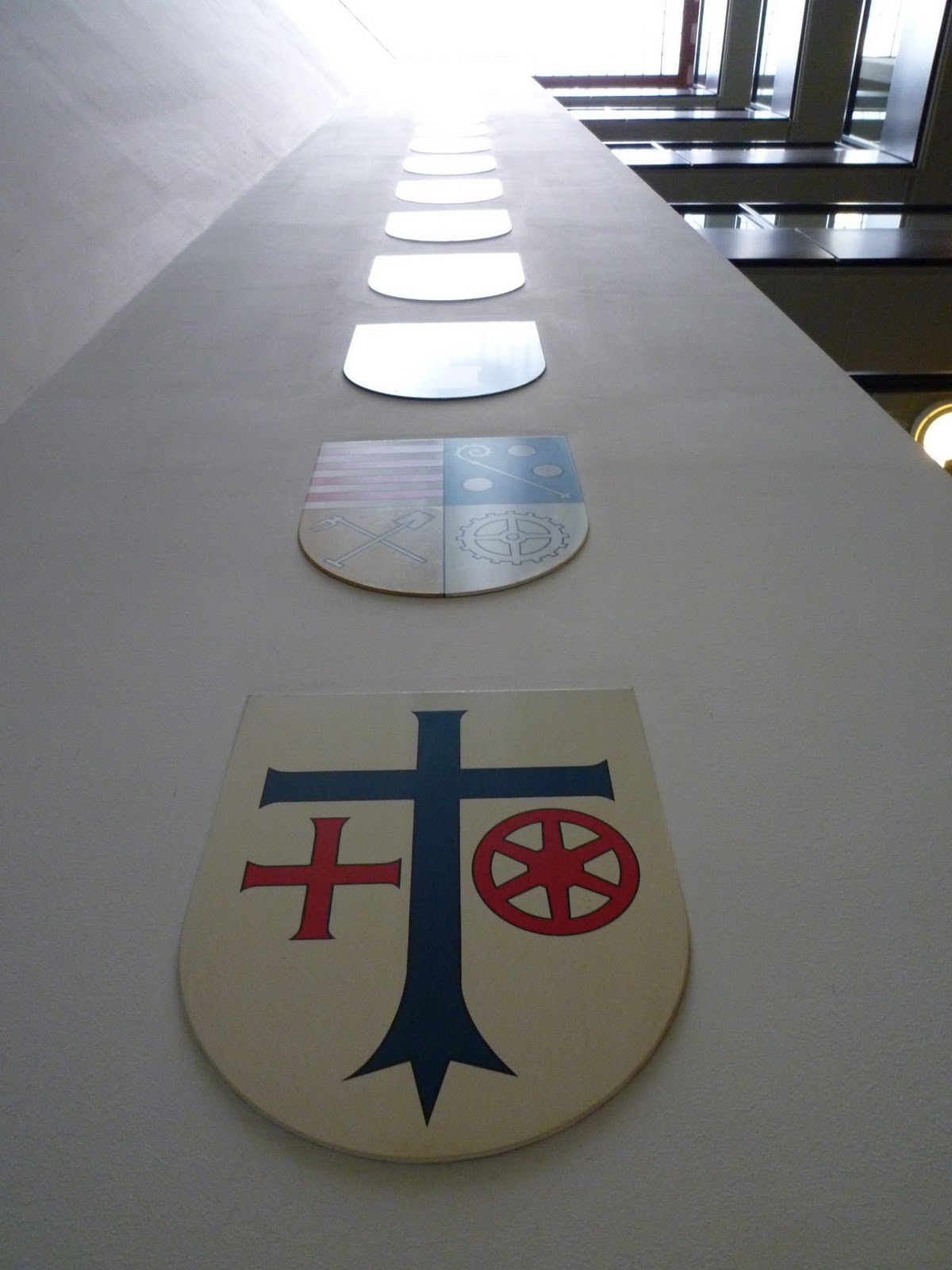 The various Mainz city coats of arms in the town hall, starting with Ebersheim at the bottom and doubtlessly ending up with Gonsenheim (with a halo) at the top.