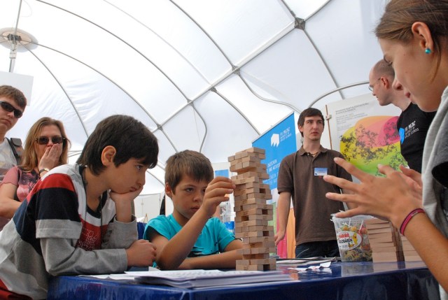 Daria and her brother Luis attempting cunningly to remove blocks from a skyscraper so that when brother/sister removes the next block, gravity takes over and the whole shebang crashes to the ground.