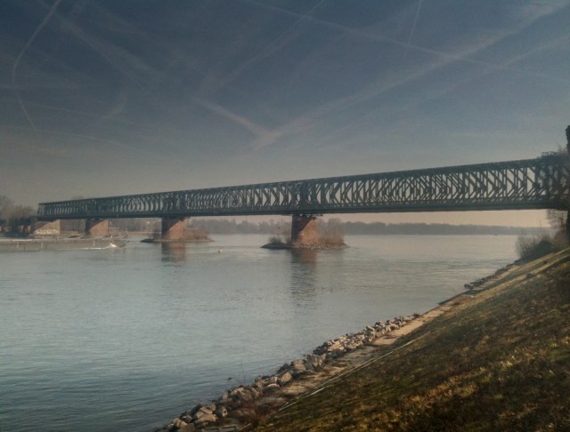 Here be that bridge again with a severe paucity of cumulo-thingies, but a surfeit (that’s the collective noun of the moment) of contrails.