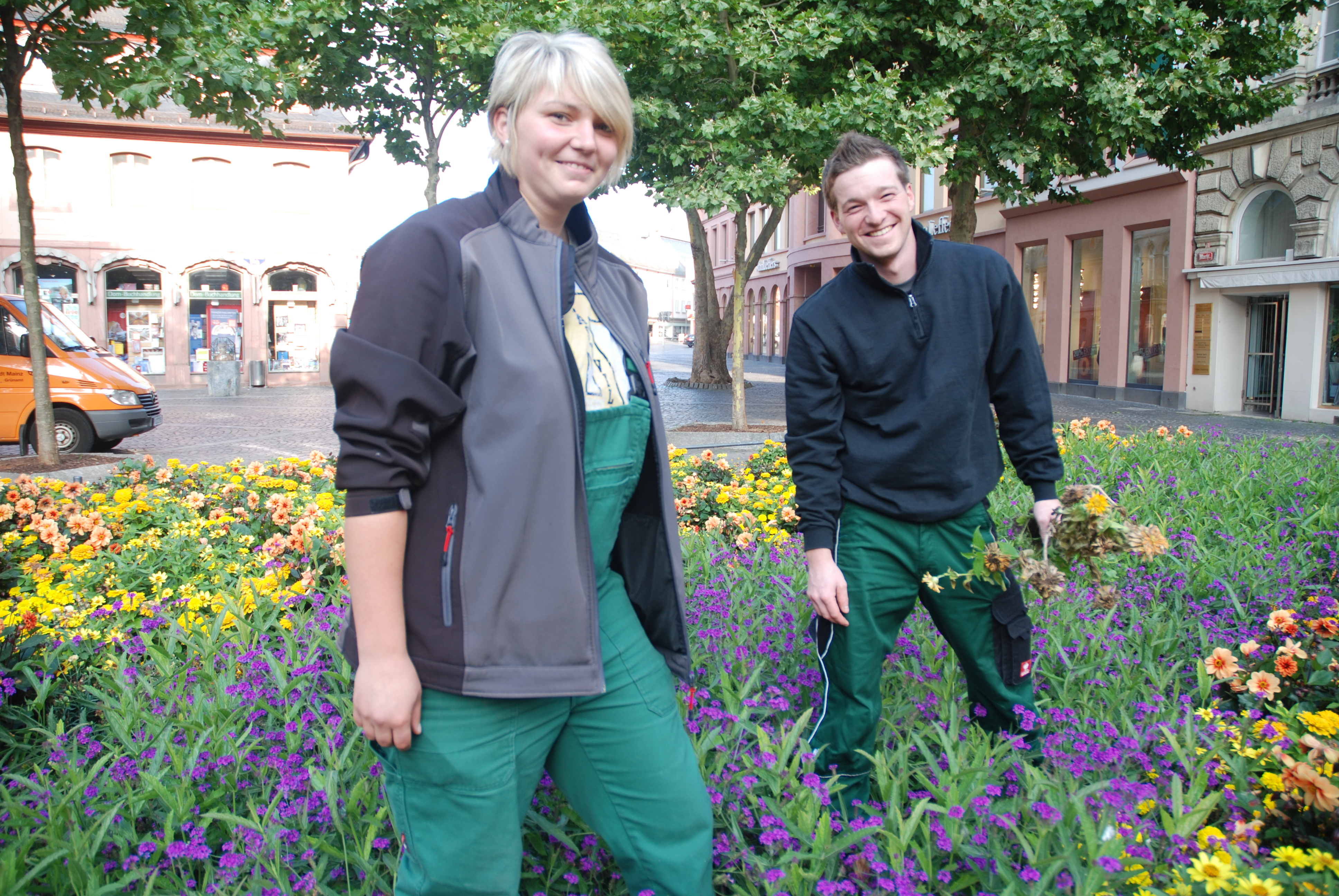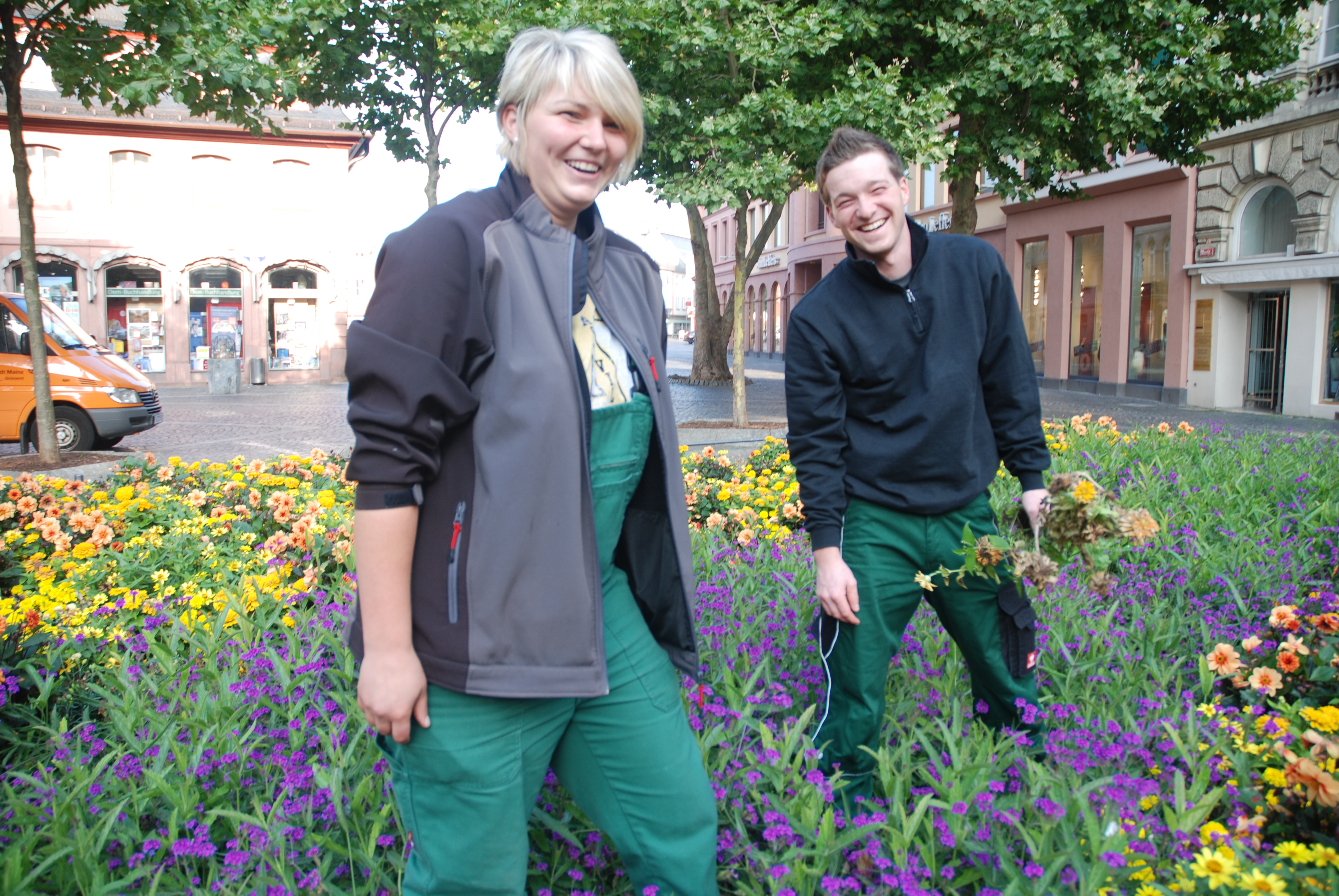 These 2 young folk from the city’s Horticultural Division ( I kid you not….) were hard at work at just after 7 a.m. the other day, tugging out tired looking bedding plants from the garden between the Cathedral and the Gutenberg museum and generally keeping the place up to scratch.