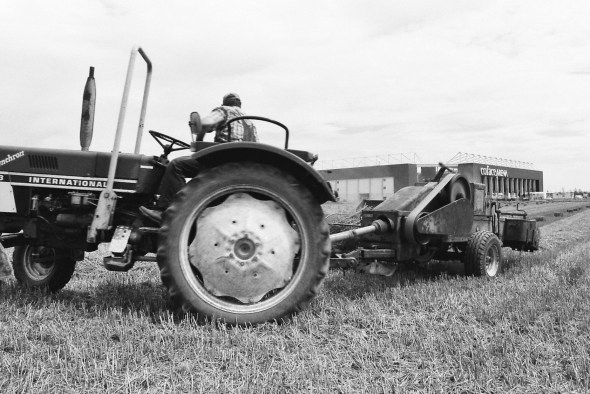 I have no idea what his harvester looks like, but this baler is at least as old as my camera* and once he’d finished baling, he drove around on his tractor while son heaved each bale onto the trailer and Mum manhandled it until it was stacked right.