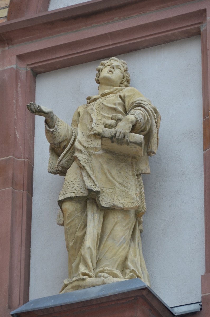 St Stephan, patron saint of meteorologists deacons, headaches, horses, coffin makers, and masons, checks out the weather above the portal of the rectory of the eponymous church.