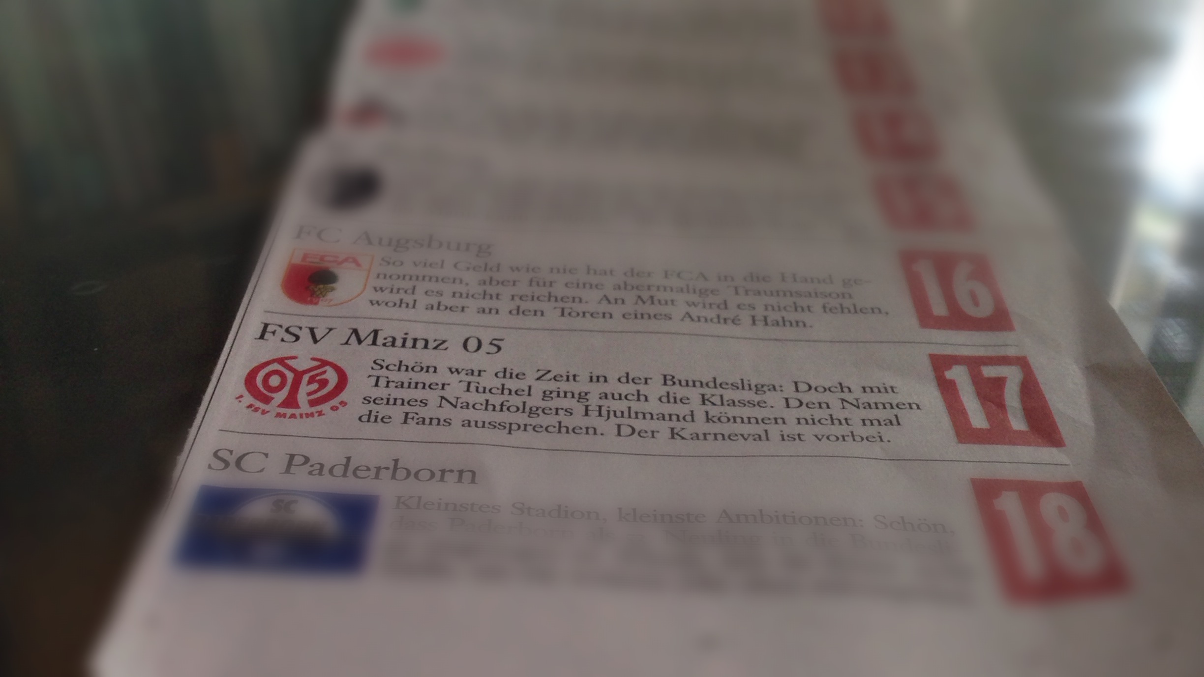 The Frankfurter Allgemeine Sonntagszeitung, a highly regarded weekly sister publication to the quality national daily FAZ, isn’t too positive about Mainz 05’s chances in the Bundesliga/First Diviso=ion this year.