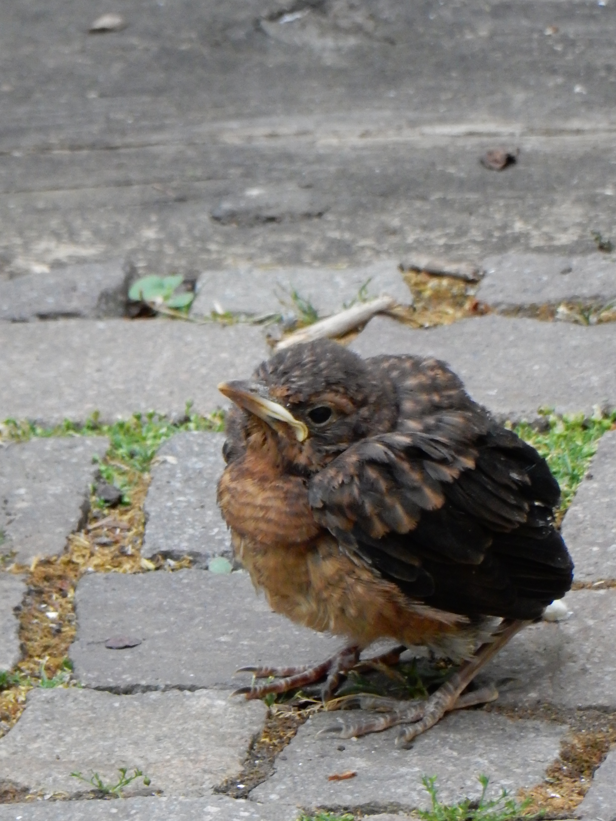 2 blackbird chicks prematurely attempted flying lessons from the nest in the honeysuckle yesterday and ended up well away from the nest, mother blackbird following them and feeding them worms.At least one of them survived the night, but I don’t hold out much hope for them, what with the sodding neighbourhood cats lurking around the place….