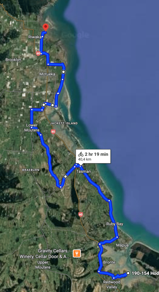 It’s 40km, just over 2 hour bike ride from the place we used to have on the Waimea estuary