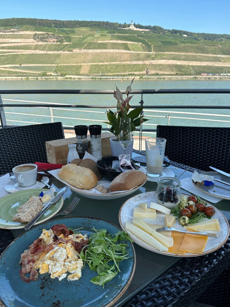 Top picture is what they tend to dish up here , this being in Bingen with the Rhine and the Rheingau vineyards in the distance – normally cheese, cold cuts and bread rolls, but the Anglo-Saxon influence (become more prevalent by the day…) leads occasionally to the addition of eggs and bacon. Which the colonial cousins across the Atlantic call “meat”.