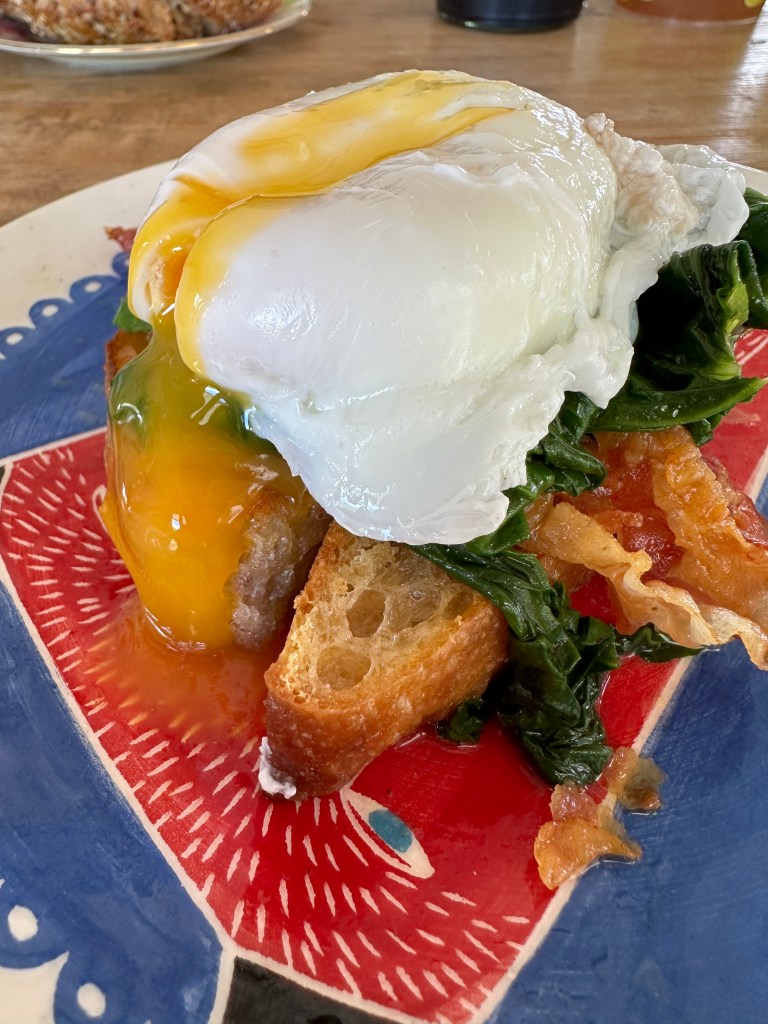 And this is what we’d have in New Zealand at the house we had there up until last year – poached egg from our neighbours’ chooks, spinach from the garden, pancetta from Prego and sourdough toast from Big Score in Nelson.