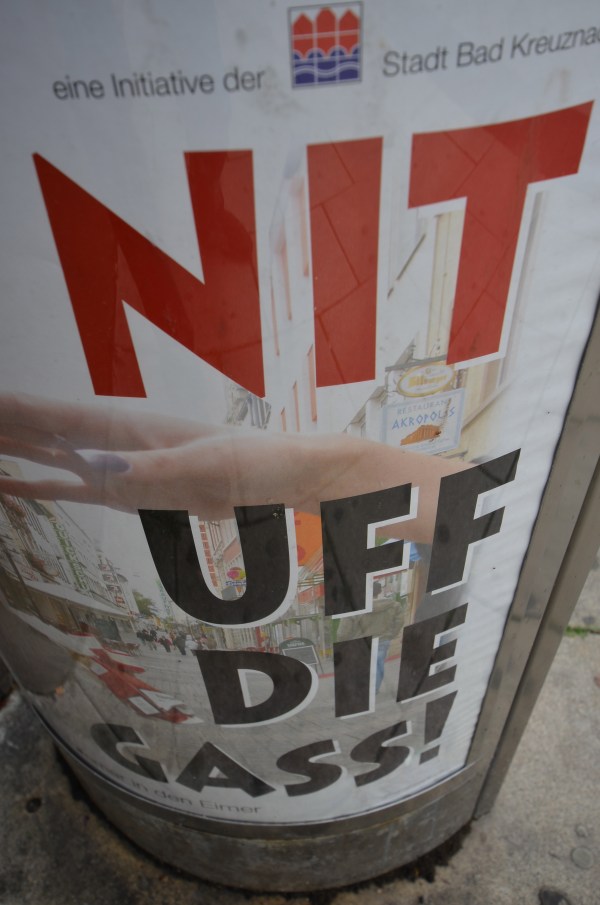 Mere metres from the spot where we rendezvoused with Bro Paul last year in August, I stumbled over (nothing broken, but thanks for asking…) this rubbish bin/trash can in Bad-Kreuznach’s…
