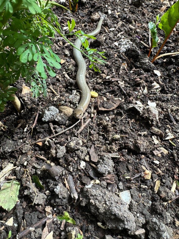 …Anguis fragilis (aka deaf adder, slowworm, blindworm, long-cripple or hazelworm. Actaully a legless lizard Making tracks between rue (Ruta graveolens) and Swiss chard, having recently shed its skin and on…