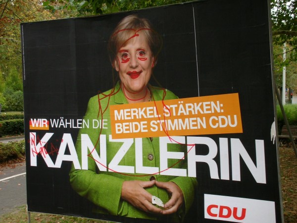 > ..and I’ll show you a loser. Defaced face in Mainz after the Federal election. Does remind me of this, though