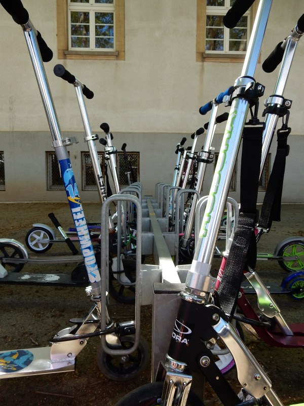 The Maler Becker school in Gonso has bike racks. AND scooter racks. Thinks: If they’re the IN THING, I must investigate