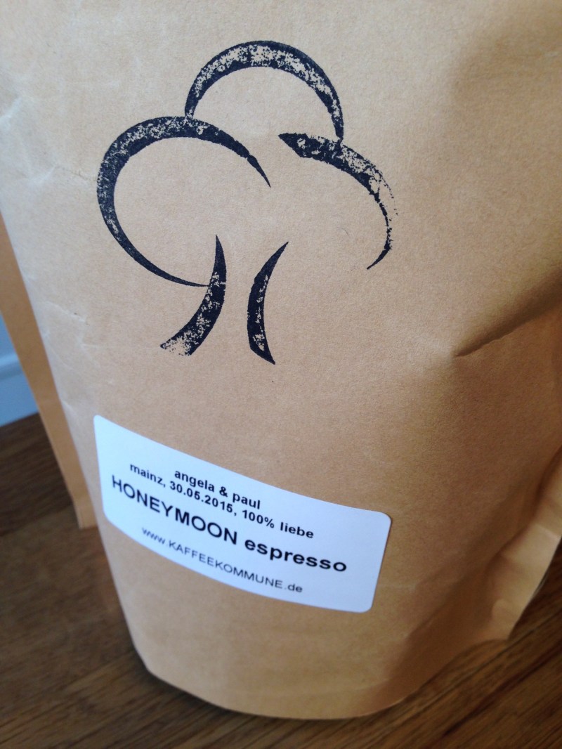 Paul Bonna’s coffee roaster, jb Kaffee in deepest Bavaria, produced a special limited edition blend to celebrate the recent matrimonials. Honeymoon Espresso and the small print says: angela & paul…