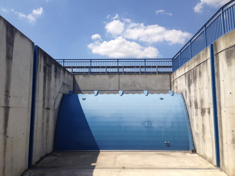 The cycle track along the Rhein takes you past some interesting stuff, but none more impressive than the massive floodgates (fish belly flap gates, if you want precision…) set into…