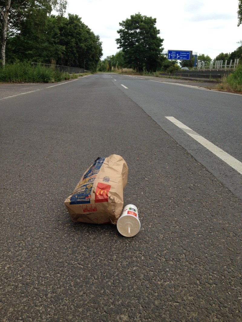 Same road, 500 metres apart. Just how hard is it to find a rubbish/trash bin around here? But, no – just sling your half-finished takeaway out of the window. And…