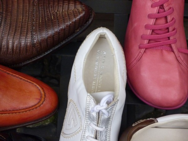 > … between the snazzy lizard skins and the puce lace-ups. White is definitely a no-no. Can’t wear white shoes after Labo(u)r Day. Nina told me that