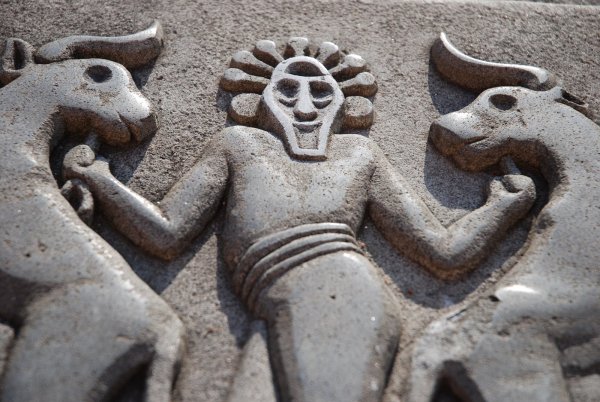 > by the horns. Or the chin. Maybe they’re billygoats after all. In which case this is all a lot of bull…. Another in the series of carvings on the…