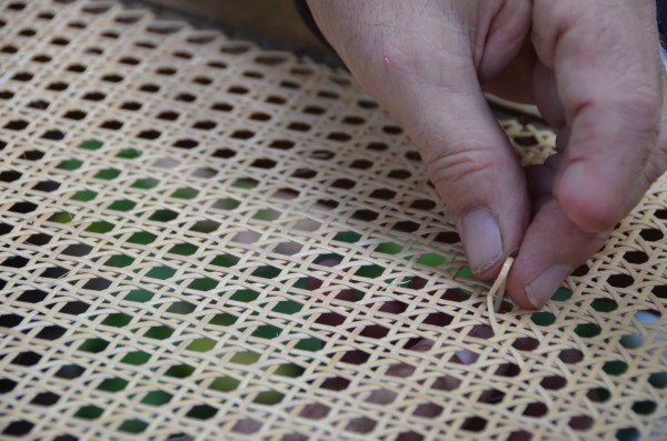 Peter Krings (in real life, a hydraulics engineer) repairs the woven seating of antique chairs. “Sometimes, I think it’s punishment for some unknown crime” he said. Seen at Karina Jungenheimer’s…