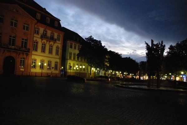 >A late summer evening – threatening sky included – looking across the Schillerplatz down the Schillerstrasse, with the Carnival Fountain silhouetted acroos the night sky.