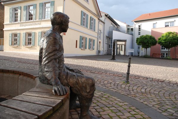 >This is St. Andreas – St Andrew – seated in front of the eponymous church in our village and looking across over the Hauptstrasse (Main Street – yes, we have…