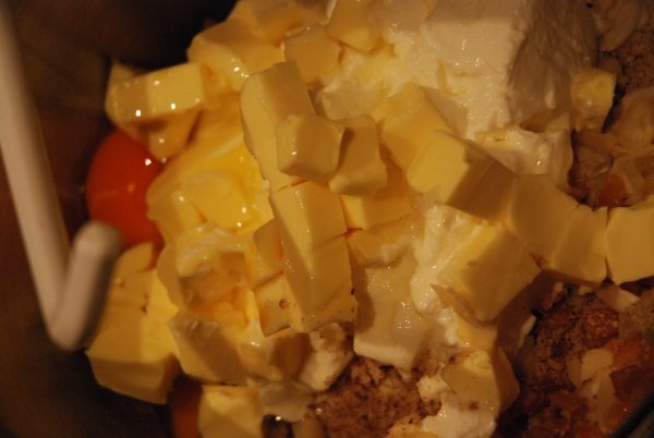 Flour Sugar Quark Baking powder Ground hazelnuts Sliced almonds Raisins Currants Nutmeg Cardamon Candied citrus peel Eggs Quark A glugglugglug of rum A mere tad of butter… Thrash around in…