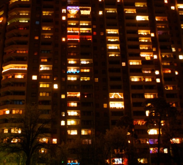 >The Vertical Village by night during the Christmas season. Pretty, eh You wouldn’t believe some of the stuff that happens here, though. Sometime over Christmas, neighbours of an apartment started…