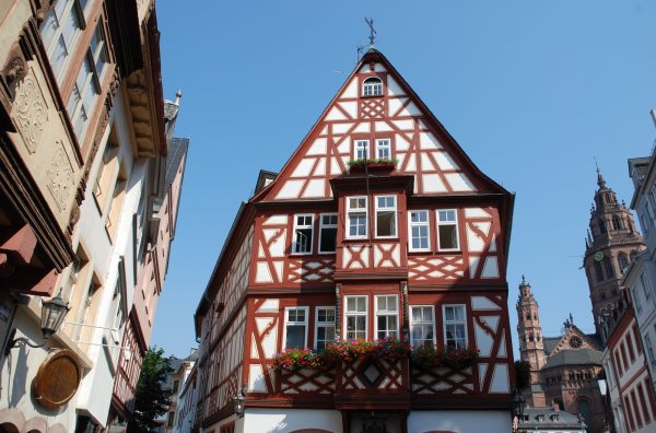 >The classic Mainz picture postcard view of the “Weinhaus zum Spiegel (Mirror)” with the spire of the cathedral on the right. The Spiegel – built in the 17th C, destroyed…